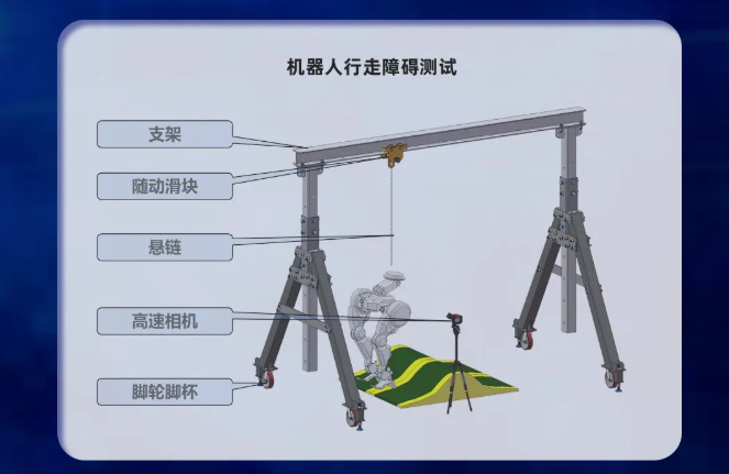 - 台架可升降高度,顶部有吊轨可辅助机器人防止摔倒。